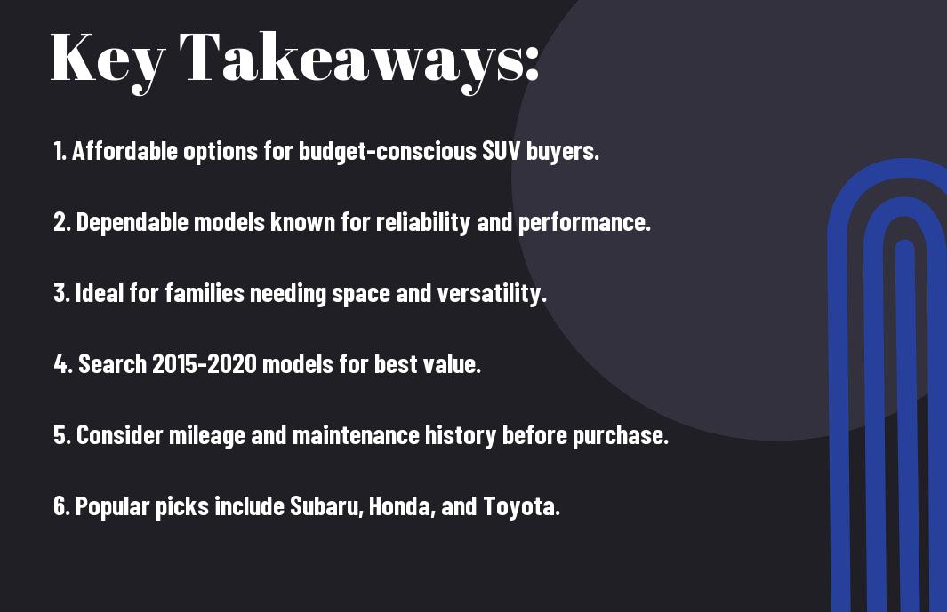 Even as you look for a used SUV under $20,000, it’s vital to consider several key factors to ensure you make an informed decision. Evaluate the vehicle’s reliability, fuel efficiency, safety features, and overall reputation. Here are some points to keep in mind: